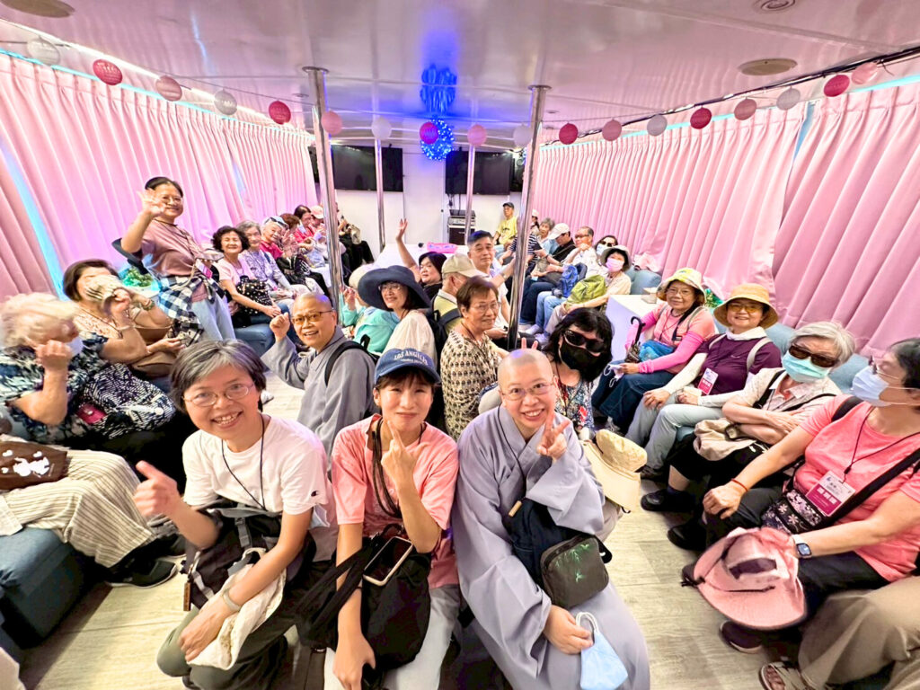 7月4日這天,由監院自淳法師領隊,帶領樂活志工40人參加台北市觀光傳播局主辦的「 長青樂活遊」。上午搭乘藍色水路觀光船,沿著淡水河欣賞河畔風光;中午來到兒童新樂園,享用美味蔬食午餐;午後則參訪陽明山中山樓,走進莊嚴典雅的建築,認識那段特別的歷史文化。